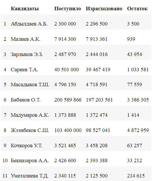 Лидером по вложениям стал один из фаворитов гонки, экс-премьер-министр Кыргызстана Омурбек Бабанов. По данным ЦИК КР, на агитацию он потратил более 200 миллионов сомов (почти три миллиона долларов). Следом за ним идет его основной соперник по предвыборной кампании, также экс-премьер-министр страны, выдвиженец от партии власти Сооронбай Жээнбеков. Он израсходовал более 100 миллионов сомов (1,5 миллиона долларов). Замыкает тройку лидер партии "Ак-Шумкар", также экс-глава кабмина страны Темир Сариев - 40,5 миллиона сомов (0,5 миллиона долларов).