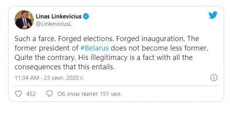 "Какой фарс. Поддельные выборы. Поддельная инаугурация. Бывший президент Беларуси не становится менее бывшим. Его нелегитимность - это факт со всеми вытекающими отсюда последствиями", - цитирует NEXTA министр иностранных дел Литвы Линаса Линкявичюса.