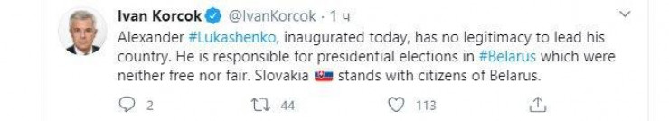 "Он несет ответственность за президентские выборы в Беларуси, которые не были ни свободными, ни справедливыми. Словакия поддерживает граждан Беларуси", - написал Корчок.