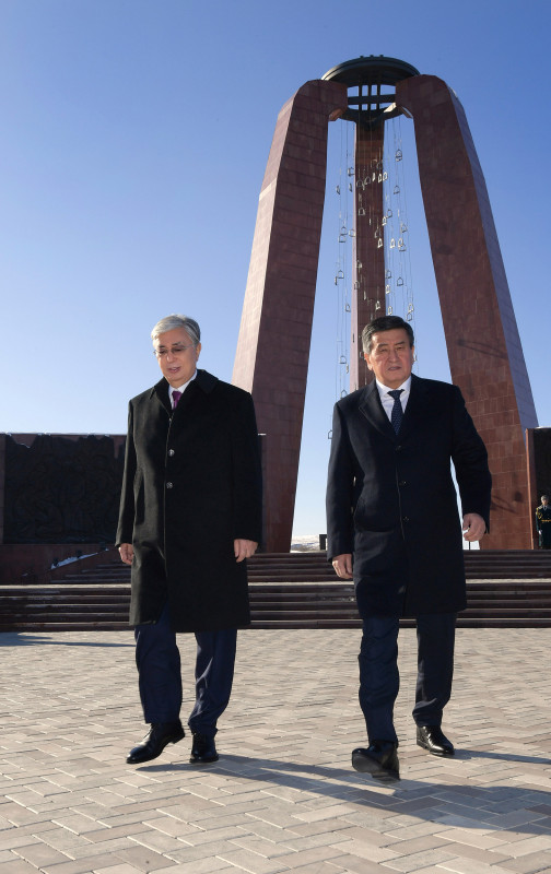 Токаев, прибывший с государственным визитом в Кыргызстан, в сопровождении президента Сооронбая Жээнбекова посетил Национальный историко-мемориальный комплекс "Ата-Бейит" в Бишкеке.