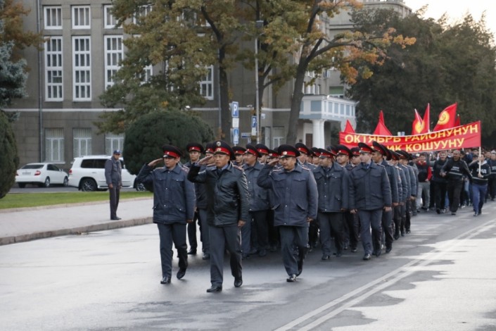 "Весь личный состав органов внутренних дел Бишкека переведен на усиленный режим несения службы с 12 октября, в связи с чем от столичной милиции требуется обеспечения общественного порядка и общественной безопасности. Также требую от каждого сотрудника большой ответственности и вежливого обращения с гражданами, проявить профессионализм и своевременно принимать меры по недопущению нарушения общественного порядка", - отметил глава ГУВД Бишкека Сталбек Рахманов.