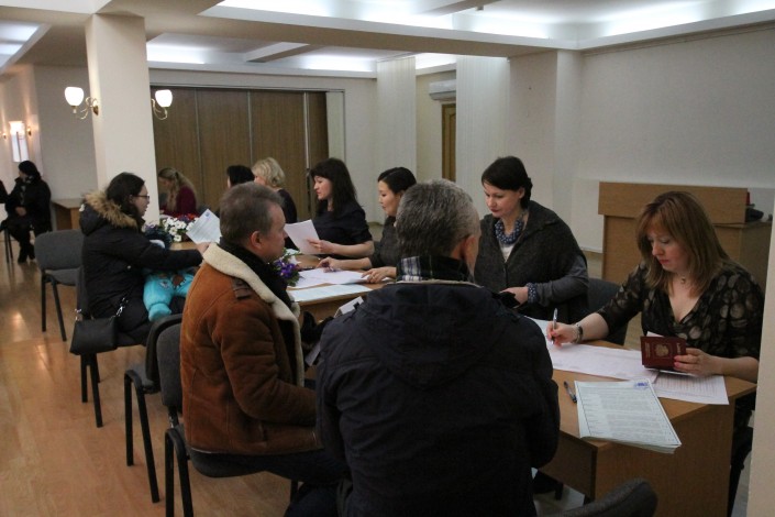 При входе в здание у посетителей проверяются паспорта. Граждан, не имеющих российского паспорта, в зал, где проходит голосование, не впускают, но исключения делают для наблюдателей и прессы.