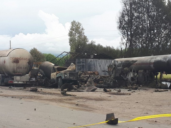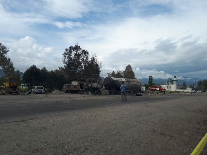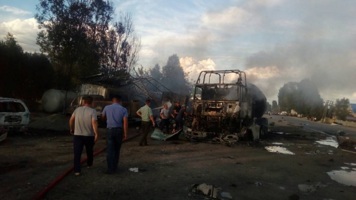 В результате мощного взрыва на частной автозаправочной станции в Иссык-Кульской области 2 человека погибло, 8 пострадали. Также, по данным МЧС КР, полностью выгорело пять автомобилей, включая два крупногабаритных бензовоза. Ранее очевидцы происшествия сообщали, что пожарные машины прибыли на место ЧП без воды. Но как пояснили в МЧС Кыргызстана, газозаправочная станция абсолютна не была приспособлена к тушению огня. Пожарным приходилось закачивать воду из ближайших арыков. В результате тушение пожара затянулось на три часа.