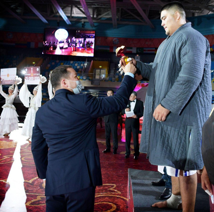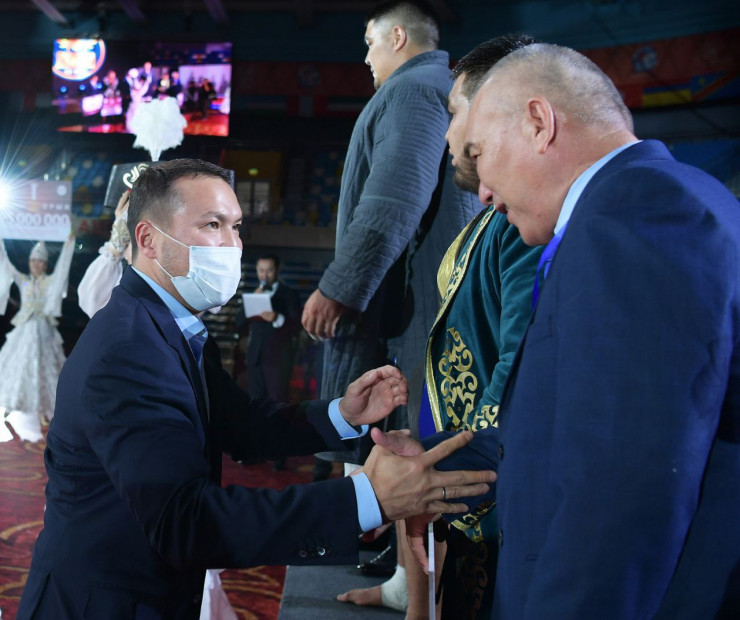 За победу Нуралинов получил 25 миллионов тенге призовых, золотой пояс и переходной "Тайтуяк" - слиток золота в виде копыта. Награду победителю вручил первый вице-президент Ассоциации Qazaq kuresi Самат Абиш.