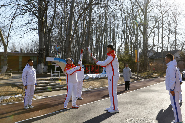 Согласно данным агентства, вице-премьер КНР Хань Чжэн зажег факел от котла в форме традиционного ритуального сосуда, известного как цзун, а затем передал его 80-летнему Ло Чжихуану, который, будучи конькобежцем, стал первым чемпионом мира по зимним видам спорта в Китае.