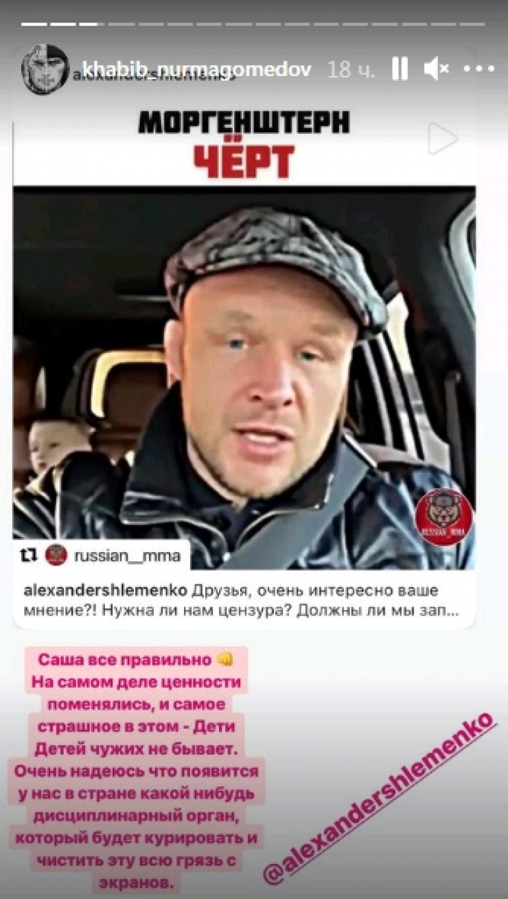 "Ценности Хабиба мне намного ближе, чем ценности, которые пропагандируют эти люди (Моргенштерн - прим.). За свои традиции. Молодцы. Они за своих девушек. А нам, мужчинам, предлагают закрывать глаза на песни про наших девушек", - заявил Шлеменко.