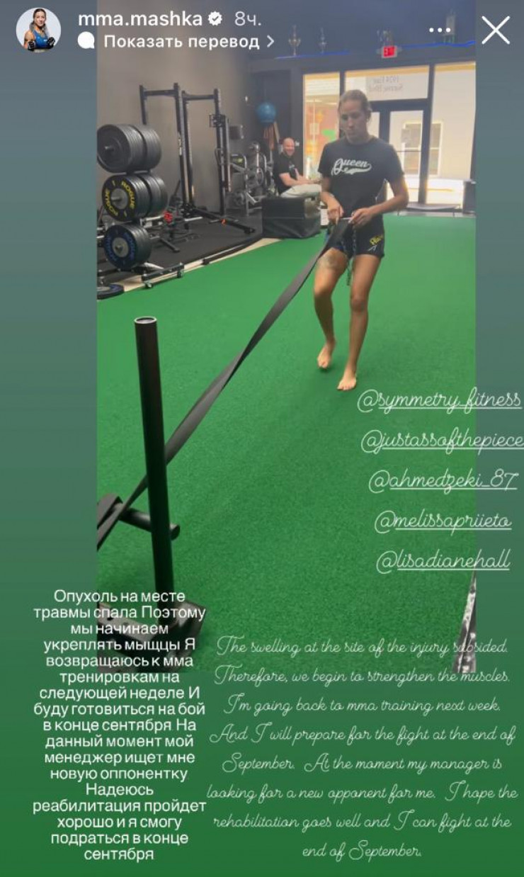"Опухоль на месте травмы спала. Поэтому мы начинаем укреплять мышцы. Я возвращаюсь к ММА-тренировкам на следующей неделе и буду готовиться на бой в конце сентября. На данный момент мой менеджер ищет мне новую оппонентку. Надеюсь, реабилитация пройдет хорошо, и я смогу подраться в конце сентября", - написала Агапова в Instagram.