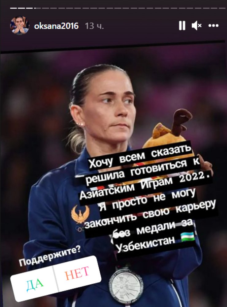 "Хочу всем сказать: решила готовиться к Азиатским играм 2022 года. Я просто не могу закончить свою карьеру без медали за Узбекистан", - написала спортсменка в сторис своего Instagram.