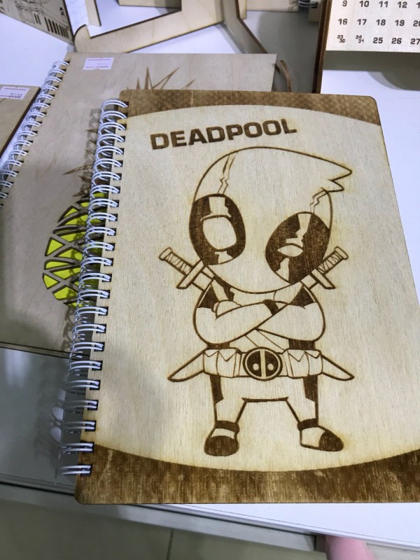 Любителям ежедневников можно преподнести необычный презент в виде деревянного блокнота с рисунками героев комиксов. Такие блокноты стоят 2500 тенге.