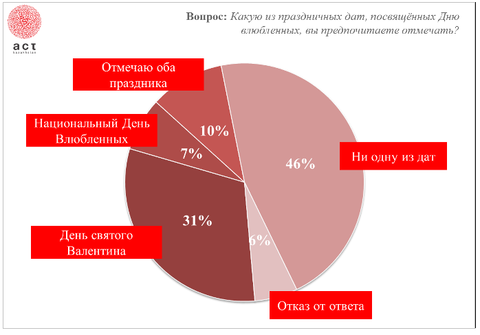 При этом 46 процентов респондентов обычно не отмечают ни День святого Валентина, ни национальный День влюбленных в Казахстане. Треть опрошенных отмечают День святого Валентина, 7 процентов - национальный День влюбленных в Казахстане, а 10 процентов респондентов отмечают обе праздничные даты.