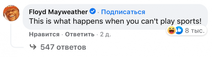 За сутки видео просмотрели более 2,3 миллиона раз и оставили почти 5 тысяч комментариев. Под постом отписались многие известные артисты, музыканты и спортсмены. Звезда мирового бокса Флойд Мейвезер - младший отшутился, прокомментировав: "Вот что бывает, когда нельзя заниматься спортом".