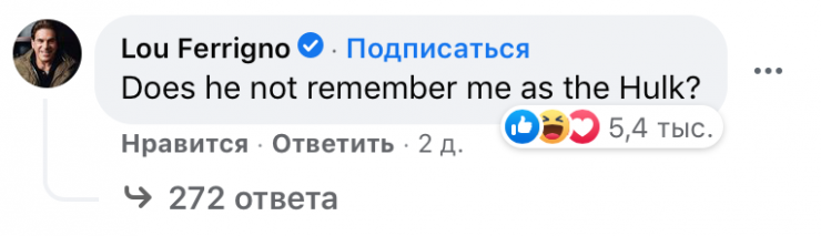 Актер Лу Ферриньо тоже решил пошутить на тему Халка. "Неужели он не помнит меня, играющим Халка", - написал он.