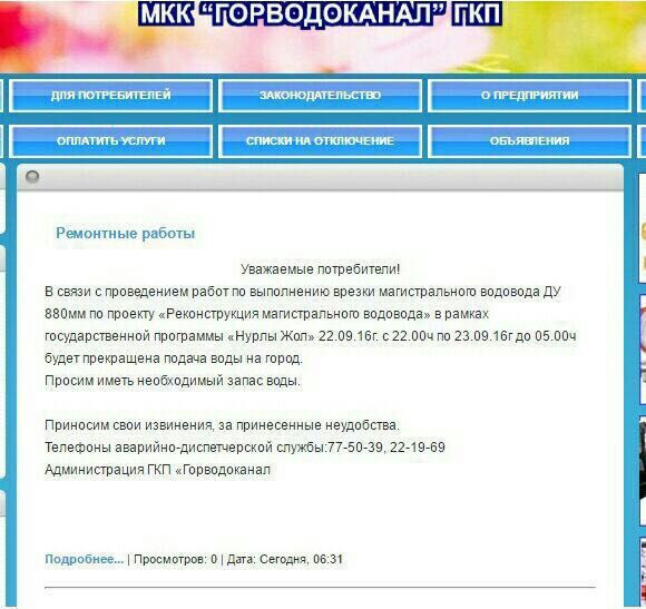 "22 сентября 2016 года в социальных сетях, а также посредством мобильных приложений была распространена информация о прекращении подачи воды на территории города в связи с проведением работ по выполнению врезки магистрального водовода ДУ 880мм по проекту "Реконструкция магистрального водовода". По данному факту ГКП "Астана су арнасы" сообщает: 22.09.2016 аварийные и плановые работы с отключением подачи воды проводиться не будут. Вышеуказанное объявление, было опубликовано на главной странице сайта ekbwater.kz, и актуально только на территории города Экибастуза", - говорится на сайте "Астана су арнасы".