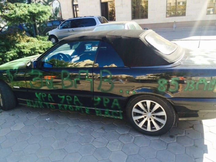 Автомобиль, надписи на котором гласят: "За ВДВ", "Никто, кроме нас", "85 - ВДВ", рассекает по столичным улицам.