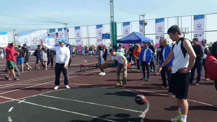 Аким Алматы Бауыржан Байбек продемонстрировал свои спортивные навыки на открытии городского чемпионата по стритболу, передает корреспондент Tengrinews.kz. Градоначальник оформил несколько мячей в корзину и сделал пасы напарнику.