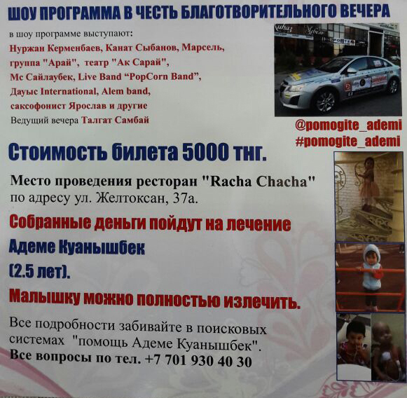 Благотворительный концерт состоится 14 сентября в 19.00 в ресторане Racha Chacha. В шоу-программе выступят: Нуржан Керменбаев, Канат Сыбанов, Марсель, группа "Арай", театр "Ак Сарай", Мс Сайлаубек, Live Band PopCorn Band, Дауыс International, Alem band, саксофонист Ярослав и другие. Входной билет стоит пять тысяч тенге. Все средства будут на месте переданы маме ребенка.