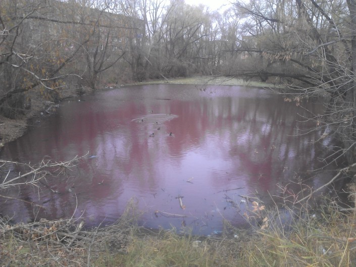 В Усть-Каменогорске во дворе дома №13 по проспекту Абая вода в болоте окрасилась в красный цвет, передает корреспондент Tengrinews.kz