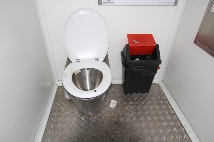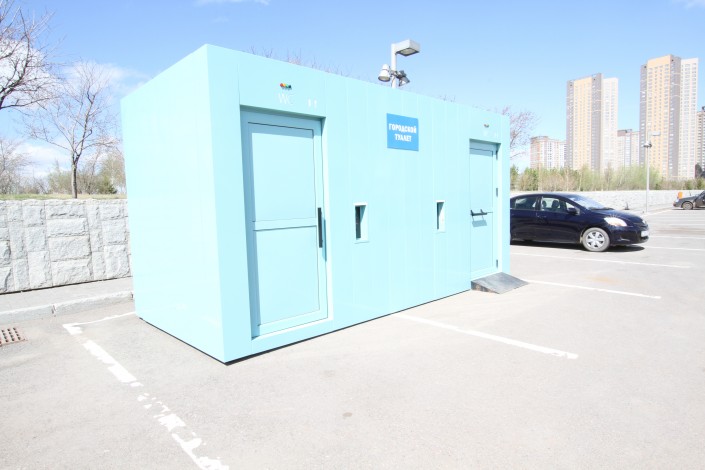 Туалет представляет из себя железный переносной контейнер с двумя кабинками, с обычным входом и входом для людей с ограниченными возможностями.