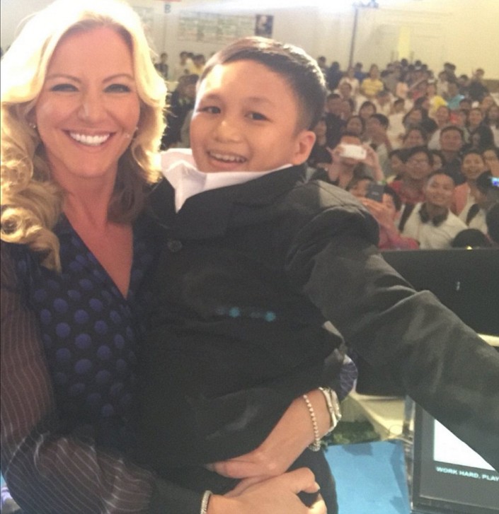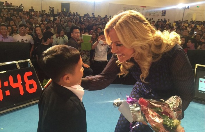 Владелица известной марки нижнего белья на глазах у трех тысяч человек взяла на руки взрослого мужчину, одного из участников встречи, приняв его за "шестилетнего ребенка".