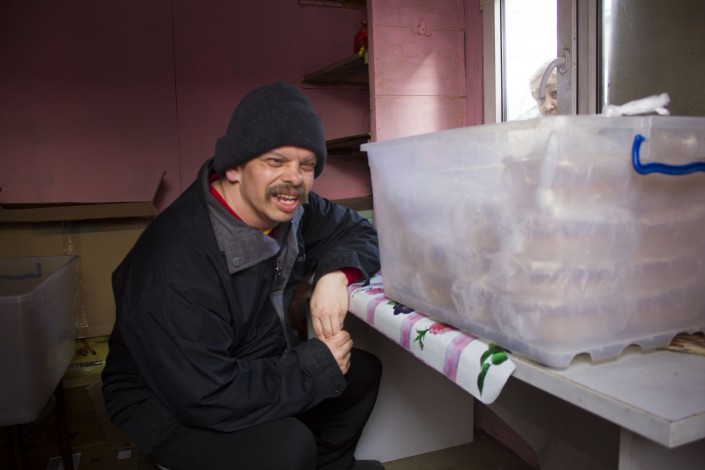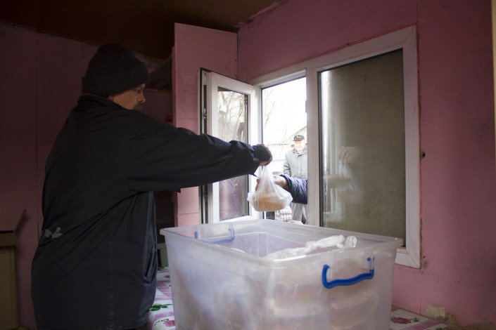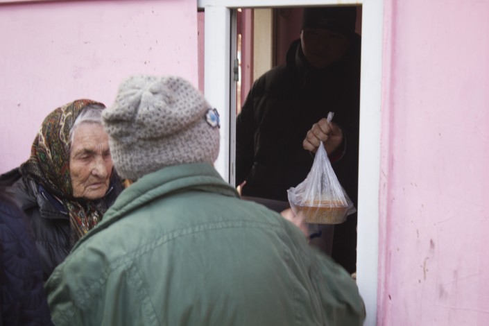 Алматинец Алексей Смирнов помогает Расиме раздавать обеды.
