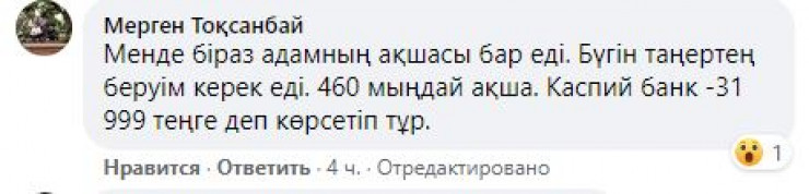 "Менде біраз адамның ақшасы бар еді. Бүгін таңертең беруім керек еді. 460 мыңдай ақша. Каспий банк -31 999 теңге деп көрсетіп тұр".