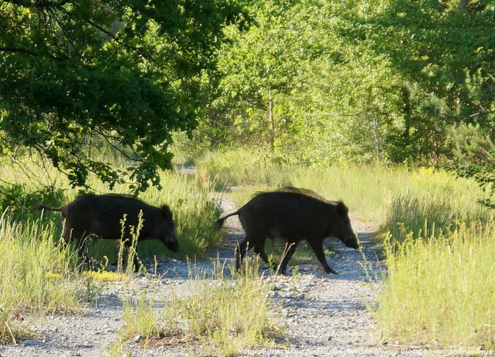 Фото кабанов опубликовано на странице Чернобыльского радиационно-экологического биосферного заповедника в Facebook. В объектив фотографа попали две особи, которые в пустынной и покрытой буйной растительностью местности переходят заросшую травой дорогу.