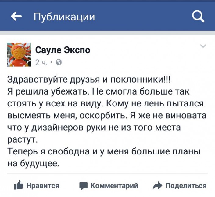 Казахстанцы с юмором отнеслись к исчезновению талисмана EXPO-2017 с водно-зеленого бульвара Астаны. В Сети разгорелось бурное обсуждение на предмет того, куда мог исчезнуть маскот. Кто-то строил догадки, что Сауле от стыда убежала сама. Другие выдвинули предположение, что талисман похитили фанаты фильмов ужасов. Позже выяснилось, что на самом деле талисман EXPO-2017 был поврежден и поэтому его увезли на реставрацию.