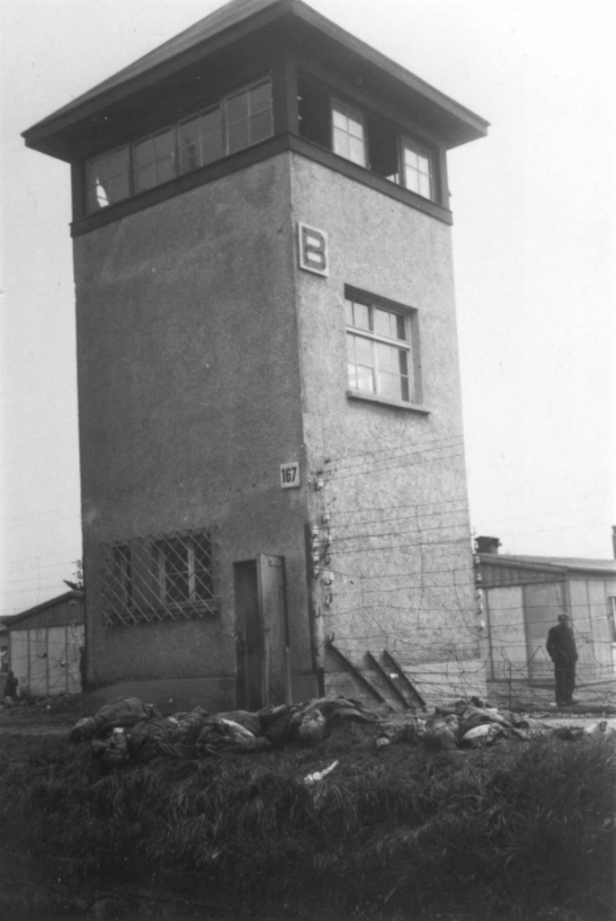 Тела расстрелянных охранников СС у смотровой башни "Б" концентрационного лагеря Дахау.