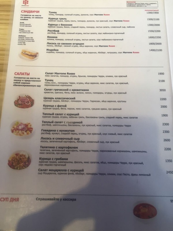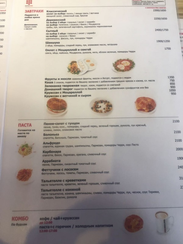 Любителям итальянской кухни поесть за 500 тенге вряд ли удастся, поскольку цены на итальянские блюда начинаются от 2 000 тенге. Стоимость кофе - от 600 тенге.