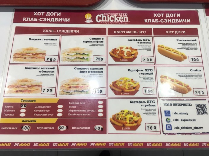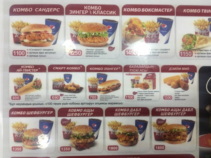 Также большой популярностью в городе пользуются рестораны быстрого питания. Например, в одном из заведений самый дешевый сэндвич стоит 700 тенге, сэндвич с куриным филе или беконом - 750 тенге. В другом популярном заведении цены на фаст-фуд несколько другие. Например, комбо сандерс, куда входит сэндвич, картошка фри и кола, обойдется в 1 100 тенге. Самое низкая цена - на "смарт комбо", туда входит курочка, картошка фри и кола.