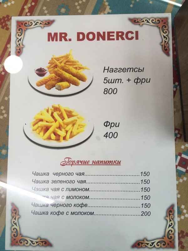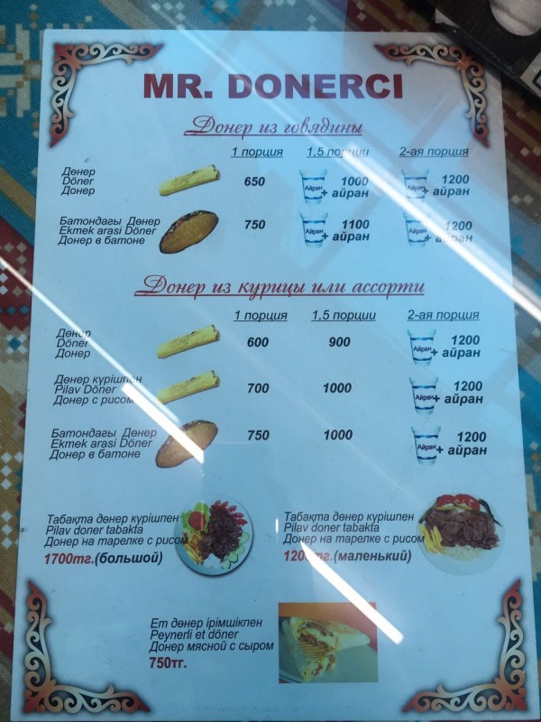 В Алматы очень популярны донерные. Один донер из курицы обойдется в 600 тенге, а из говядины - 650. Донер с рисом продают по 700, а донер в батоне - по 750 тенге. Также здесь можно приобрести порцию картошки фри за 400 тенге и чашку чая за 150 тенге. Итого средний перекус в донерной обойдется примерно в 1 000-1 600 тенге.