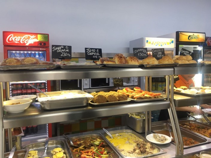 Разнообразное меню предлагает сеть столовых "Каганат". Здесь стоимость горячих блюд варьируется от 400 до 1 200 тенге. Так, например, порция солянки стоит 405 тенге, мясо по-французски - 730 тенге, салат "Вече" - 320 тенге, чай с молоком - 85 тенге, компот - 90 тенге. Итого средний чек за один обед выходит примерно 1 150 тенге.