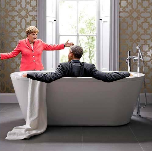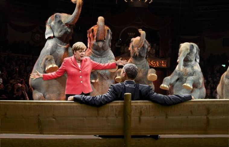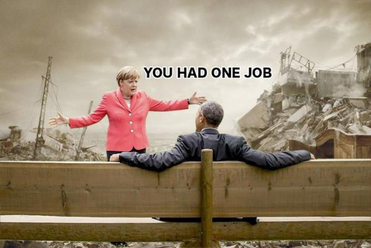 На одной из фотожаб, опубликованной немецкой газетой Bild, беседа Меркель и Обамы проходит на фоне разрушенного мира. Судя по всему, эти "декорации" - "работа" американского президента.