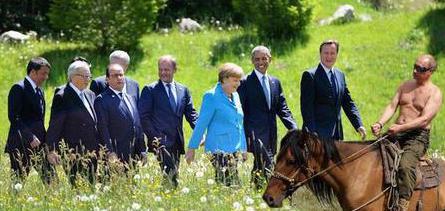 На фото удачно пойман момент, когда Обама вальяжно сидит на деревянной скамье спиной к камере, внимая эмоциональному рассказу активно жестикулирующей Меркель. Процесс общения политических лидеров проходил на фоне альпийских лугов.