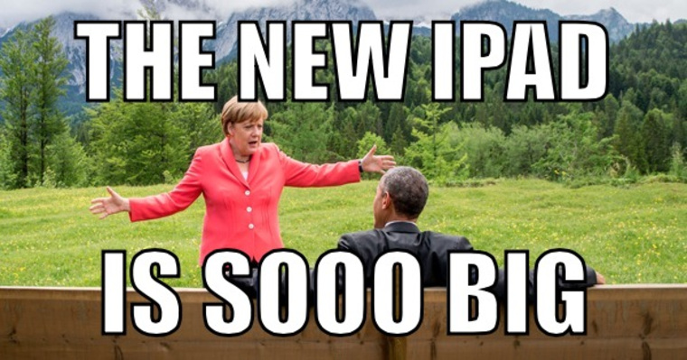 На другом разводящая руками Меркель демонстрирует размер нового IPad.