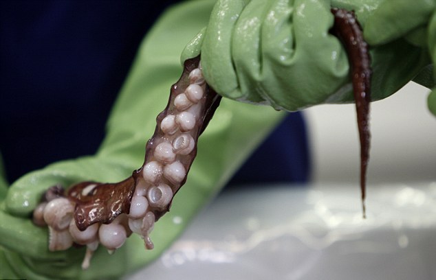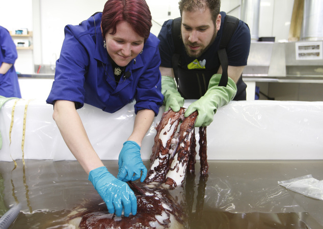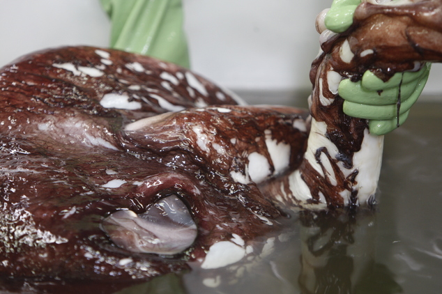 Свой улов рыбаки сделали еще в декабре 2013 года. Однако известно об огромном кальмаре, который чрезвычайно редко попадается на глаза людям, стало только сейчас. Восемь месяцев он был заморожен, и вот на днях ученые оттаяли животное в лаборатории и представили миру.