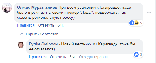"Зашла к нему в кабинет и обнаружила его со свеженьким номером Казправды. Особо не верящие могут приблизить дату и удостовериться. На вопрос, что отвечать журналистам - где сейчас шеф? - была интеллигентно послана... работать", - написала Маржан Ельшибаева.