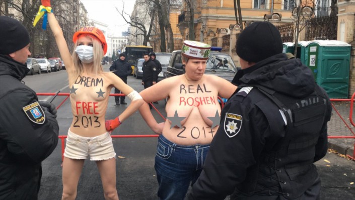 По данным издания, две девушки обнажили грудь на улице Банковой возле кордона силовиков, охраняющего проход во двор администрации президента, на их телах были надписи "Dream 2013 - Free" и "Real 2017 - Roshen". Акция длилась не более минуты, так как активисток задержала полиция. С видео можно ознакомиться здесь.