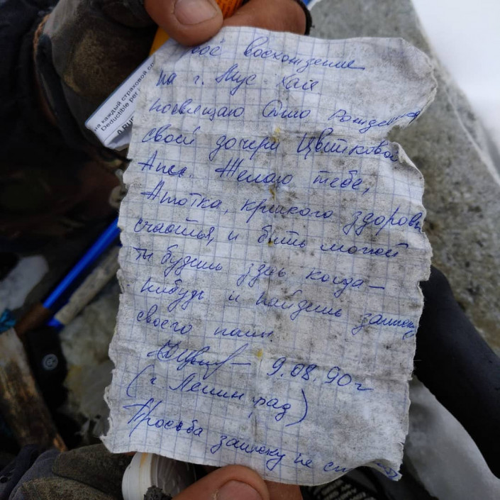 "Свое восхождение на гору Муус Хайа посвящаю дню рождения своей дочери Цветковой Ани. Желаю тебе, Анютка, крепкого здоровья, счастья, и, быть может, ты будешь здесь когда-нибудь и найдешь записку своего папы. 9.08.90 г. (г. Ленинград)", - говорится в послании, написанном на тетрадном листочке.