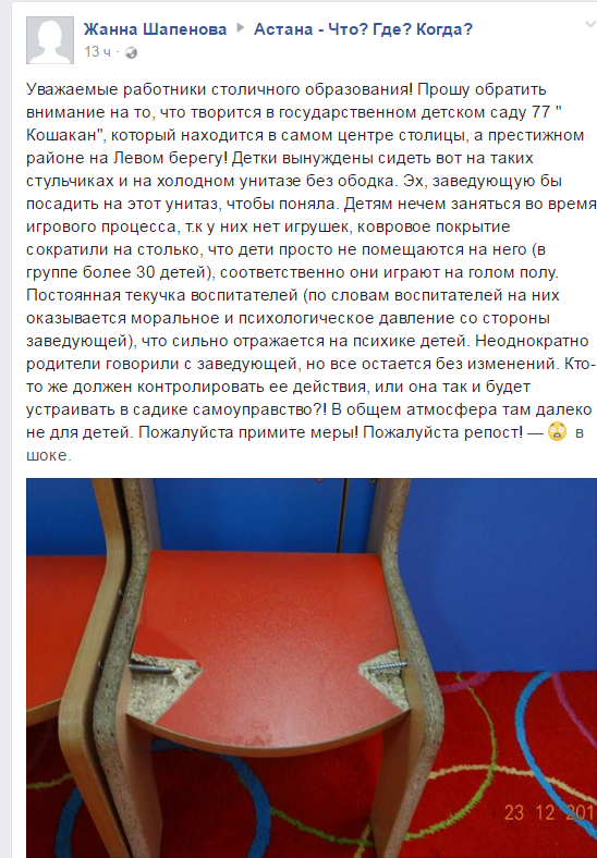 В Facebook в группе "Астана - Что? Где? Когда?" пожаловались на условия в детском саду в Астане. По словам Жанны Шапеновой, в дошкольном учреждении постоянная текучка воспитателей, плачевное состояние мебели для детей.