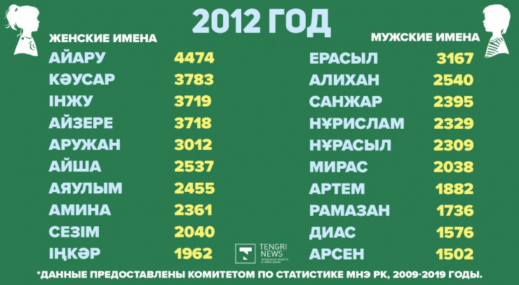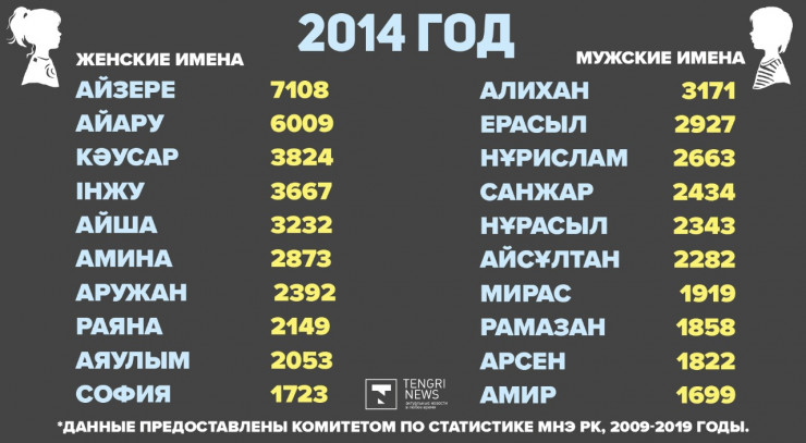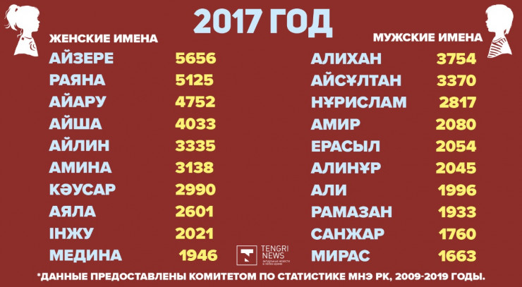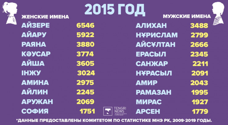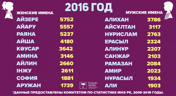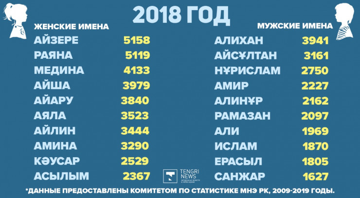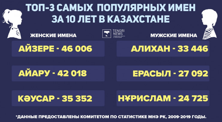 По данным Комитета по статистике МНЭ РК, самыми популярными именами для девочек оказались: Айзере - 46 006 человек, Айару - 42 018 девочек и Кәусар - 35 352 малышки. Для мальчиков чаще всего выбирали имена Алихан, для 33 446 малышей, Ерасыл - 27 092 человека и Нұрислам для 24 725 ребят.