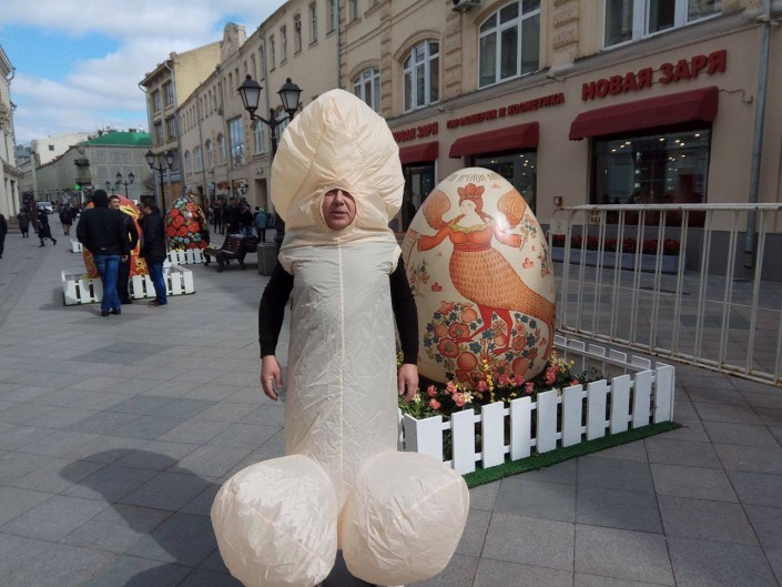 Стражи порядка заявили, что работник телевидения нарушает общественный порядок. Ведущий снимал сатирический сюжет, посвященный инсталляции на улицах Москвы, и был одет в надувной костюм "Шалун", напоминающий пенис.