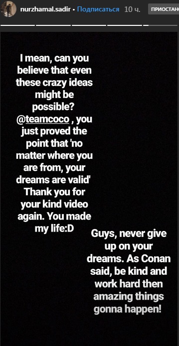 Казахстанка Нуржамал Садир поблагодарила Конана О'Брайена в Instagram. "Вы можете поверить, что такие сумасшедшие идеи могут быть возможными. Конан доказал, что не важно, откуда вы родом, ваши мечты сбываются. Спасибо за видео", - написала девушка.