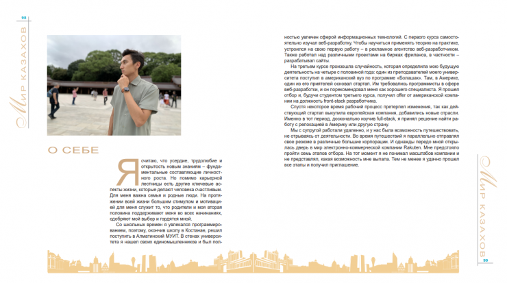 "Біздің команда үлкен. Қазір тек компанияның ішінде белгілі жобамен жұмыс істеп жатырмыз. Сонымен қатар, менің жеке кішігірім жобам бар. Жұмыс өте қызық, басқа топтың адамдарымен де жұмыс істеуге мүмкіндік бар", - дейді жас маман.