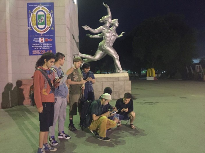 Группа ребят ловит покемонов возле центрального стадиона в Алматы.