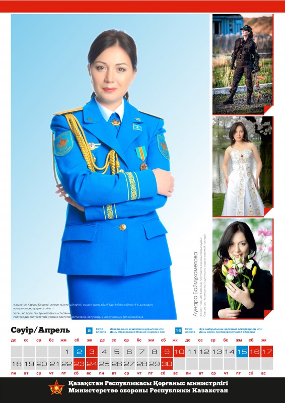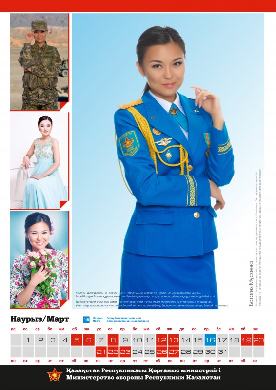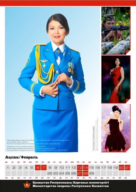 Календарь, составленный по итогам конкурса красоты среди сотрудниц Министерства обороны "Батыр Арулар", опубликован тиражом в тысячу экземпляров. О том, что каждая из 12 финалисток украсит страницы определенного месяца специализированного календаря на 2016 год, было объявлено сразу после старта конкурсного интернет-голосования.