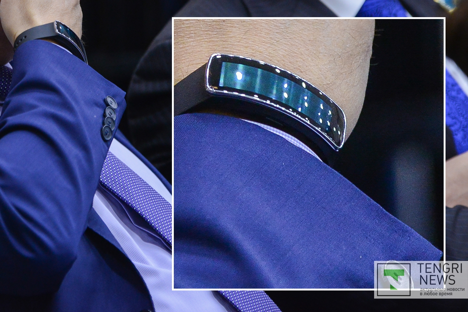 Браслет на фото напоминает Samsung Gear Fit - первое интеллектуальное носимое устройство с изогнутым Super AMOLED-дисплеем, созданное специально для занятий фитнесом и спортом.