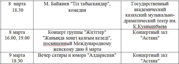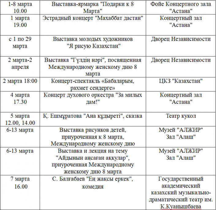 По данным столичного Управления культуры, архивов и документации, в честь Международного женского дня в культурных учреждениях города запланировано проведение 13 мероприятий. Также 2 марта в 18.00 часов в ЦКЗ "Казахстан" состоится постановка исторического концерта-спектакля, посвященная 100-летию движения "Алаш". В спектакле примут участие знаменитые артисты Роза Рымбаева, Айгуль Иманбаева, Болат Абдильманов, Нуркен Отеулов, Асылхан Толепов и другие звезды казахстанской эстрады.