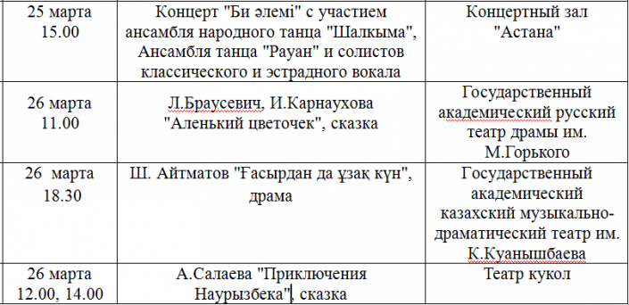 Так, в концертном зале "Астана" 23 марта пройдет вечер сатиры и юмора "Шаншар". 25 марта состоится концерт "Би әлемі" с участием ансамбля народного танца "Шалкыма", ансамбля танца "Рауан" и солистов классического и эстрадного вокала.