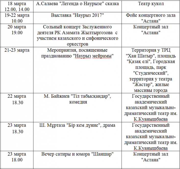 В рамках празднования Наурыз мейрамы в Астане пройдет около 20 культурных мероприятий. Основные празднования будут организованы на открытых площадках. Массовые народные гуляния состоятся 21-23 марта на территории у ТРЦ "Хан Шатыр", на площади "Қазақ елі", на городской площади, в парке "Студенческий", на территории у театра "Жастар" (район вокзала), а также во всех жилых массивах города. Кроме того, в праздничные дни для горожан и гостей столицы пройдут концерты, выставки, а также премьерные показы спектаклей в театрах города.
